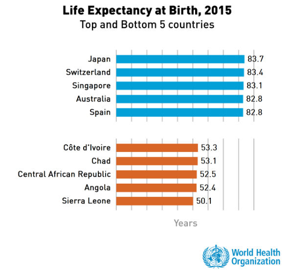 Life expectancy increased by 5 years between 2000 and 2015, the fastest increase since the 1960s. Those gains reverse declines during the 1990s, when life expectancy fell in Africa because of the AIDS epidemic, and in Eastern Europe following the collapse of the Soviet Union. The increase was greatest in WHO's African Region. Global life expectancy for children born in 2015 was 71.4 years (73.8 years for females and 69.1 years for males), but an individual child’s outlook depends on where he or she is born. The report shows that newborns in 29 countries – all of them high-income -- have an average life expectancy of 80 years or more, while newborns in 22 others – all of them in sub-Saharan Africa -- have life expectancy of less than 60 years.